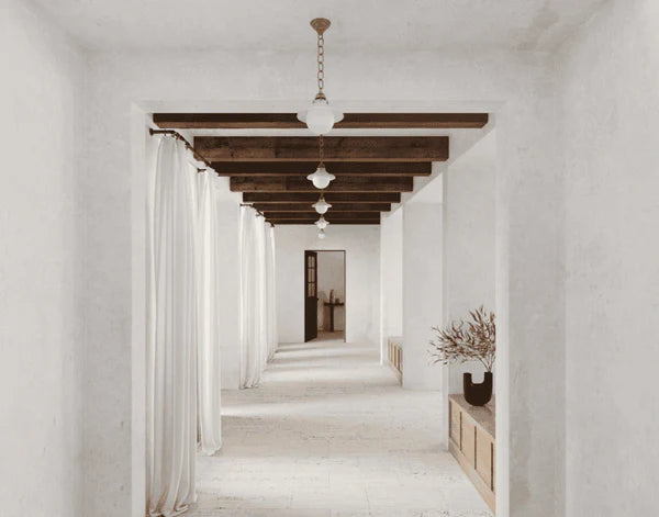 The rustic wooden beams, framed by softly lit spheres, create a tranquil and breezy atmosphere in the corridor.